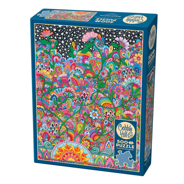 Angelea Van Dam aka ‘Hello Angel’ is passionate about colour. From her home in New Zealand, she takes doodling to new heights of intricate fun. This 500 piece jigsaw puzzle features bold colours, flowers, stars, and a fiery sun.