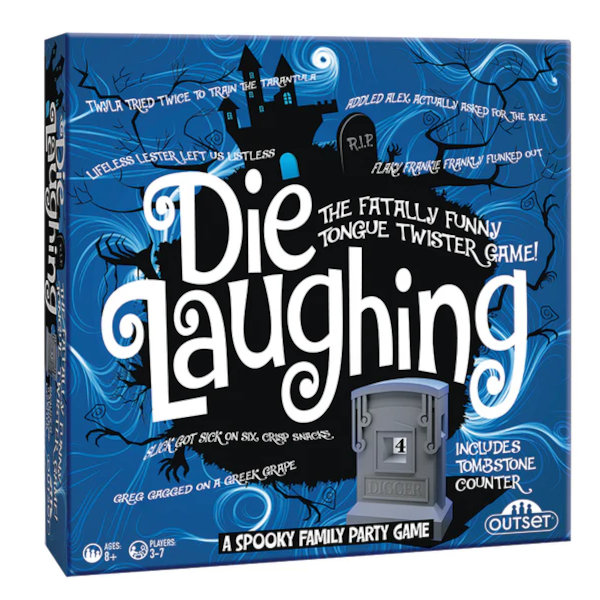 Die Laughing is a fast-paced battle of wit and skill where players race to outscore each other as either the Grim Reader or a Digger. As the Grim Reader, you’ll recite tricky tongue-twisting epitaphs, while the Diggers frantically search the Coffin Cards for matching bodies or elusive hidden treasures.