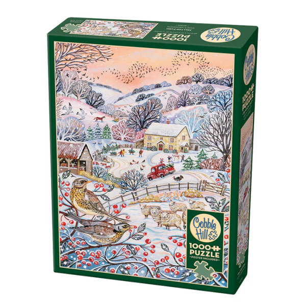 There’s magic in every hillside of this Hilltop Farm puzzle by artist Lucy Grossmith. A yellow farmhouse stands at the heart of a snowy countryside where life hums softly through the cold. Birds flit among red berries, sheep roam the fields, and a classic red truck returns home carrying a Christmas tree. Children roll snowballs into a snowman while horses and chickens move gently through the snow. A soft sky full of fluttering birds completes this heartwarming portrait of winter in the country.