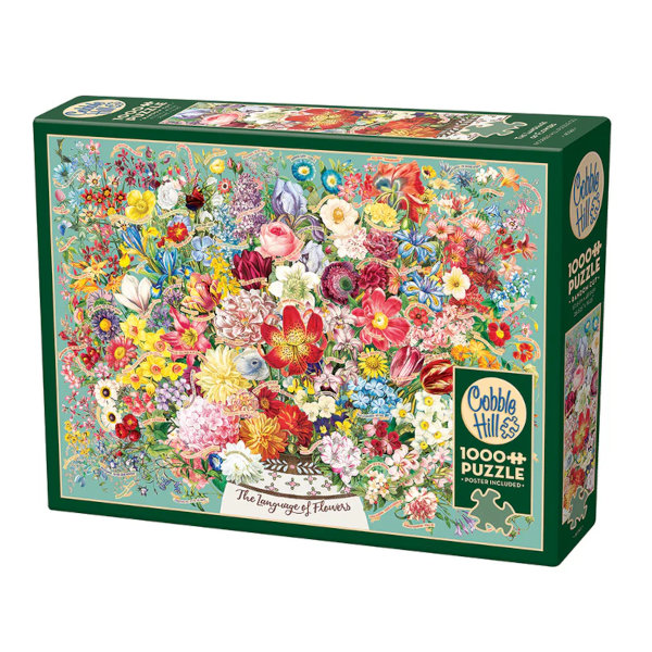 “The Lanugage of Flowers” 1000 piece puzzle was designed in-house by Allegra using public domain assets. That is hundreds of vintage botanical flower paintings were raided for their best blooms and assembled into this epic bouquet. To balance the old world topic and paintings, contemporary leet-speak was used on the banners labelling the flowers, thus what was originally described as “looking for true friendship” becomes “Let’s be besties!” – shorter and more fun. No AI involved.