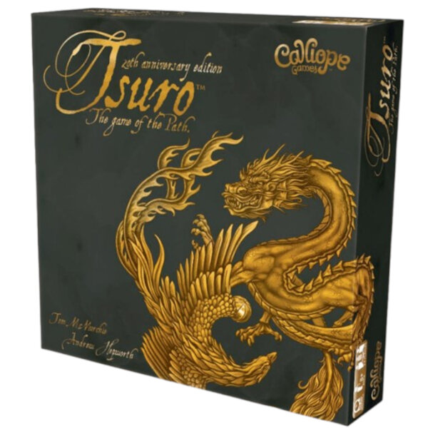 This very special 20th Anniversary Edition of Tsuro: The Game of the Path is adorned with new art presented in a rich gold on an elegant black background. The tiles are faux jade and the premium Dragon stones are simulated marble & granite, and are stored in a lush pawn bag. Tsuro is now more elegant than ever!