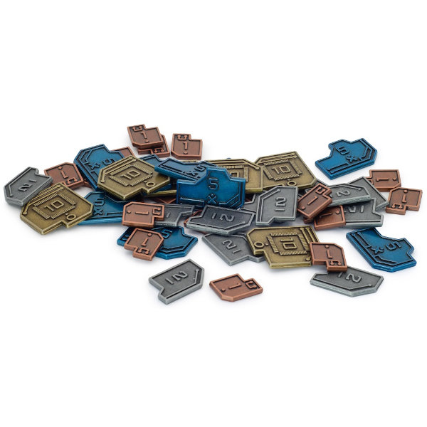 These 45 metal coins were designed specifically for Vantage (the game will include cardboard tokens). They include $1 (x18), $2 (x12), $5 (x9), and $10 (x6) coins made of zinc. One pack more than covers the quantities needed for a full 6-player game.
