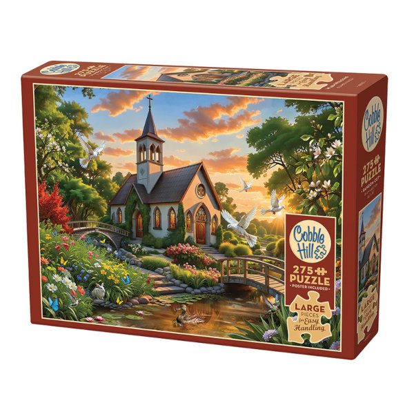 One can’t help but feel a Warm Welcome upon entering the garden to the lovely little church inthe countryside. Doves, ducks, and bunnies nestle amongst the flowers and foliage. Creator James Piazza has made art using a variety of mediums and has worked with many manufacturers in creating commercially successful images. From pen and ink to Photoshop and now AI, he’ll adapt to any medium to realize his artistic visions. Easy Handling 275 piece puzzles from Cobble Hill feature large size pieces that capture more detail per piece and a reference poster is included. Great for date nights or quiet time alone.